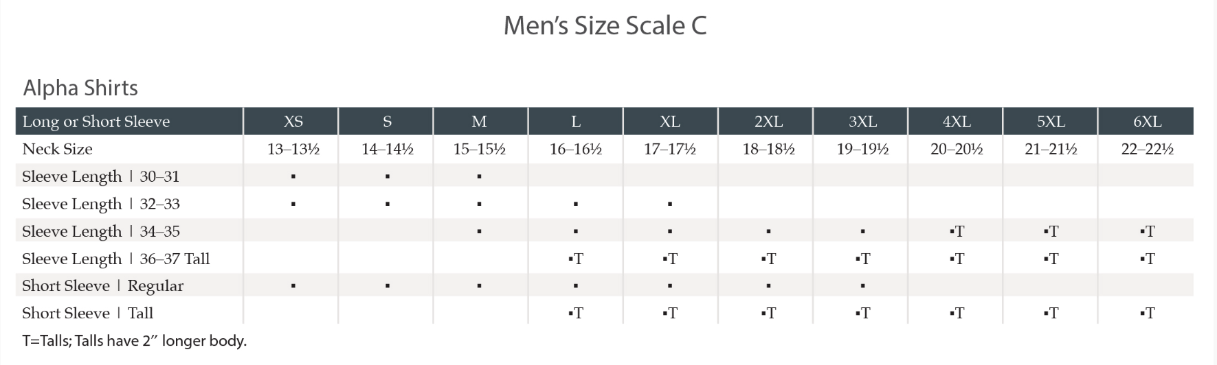 | Neck Size | 13-13 1/2 | 14-14 1/2 | 15-15 1/2 | 16-16 1/2 | 17-17 1/2 | 18-18 1/2 | 19-19 1/2 | 20-20 1/2 | 21-21 1/2 | 22-22 1/2 |
