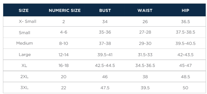 | Bust | 34 | 35-36 | 37-38 | 39.5-41 | 42.5-44.5 | 46 | 47.5 |
