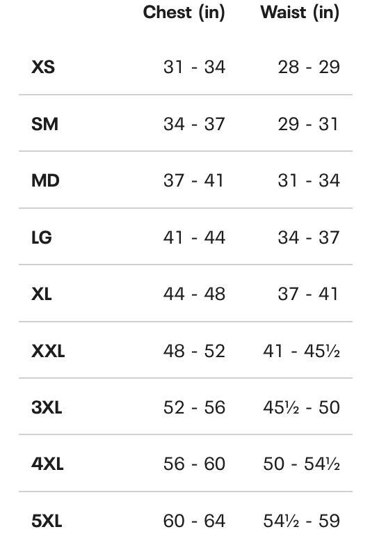 | Chest | 34"-37" | 37"-41" | 41"-44" | 44"-48" | 48"-52" | 52"-56" | 56"-60" |