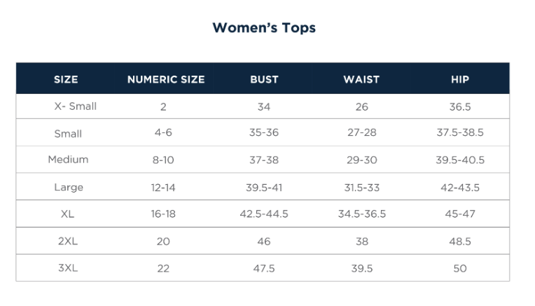 | Bust | 34 | 35-36 | 37-38 | 39.5-41 | 42.5-44.5 | 46 | 47.5 |