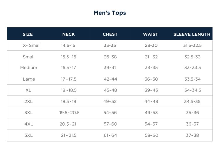 | Chest | 36-38 | 39-41 | 42-44 | 45-48 | 49-52 | 54-56 | 57-60 | 61-64 |